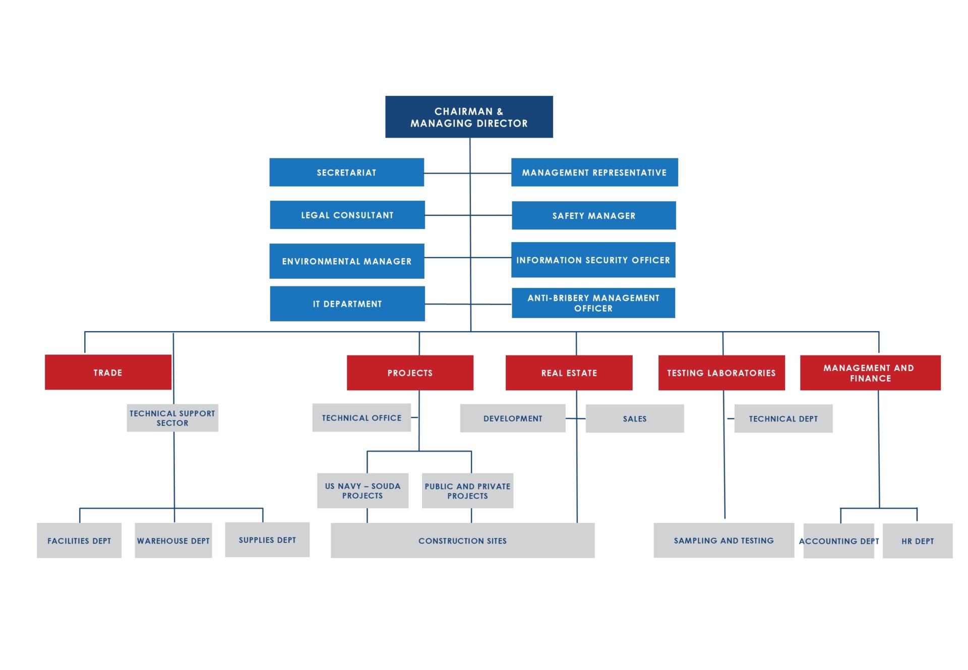 The company’s organizational structure is based on the principle of Project Management and includes the Directorates of Administrative and Financial Services, the Directorate of Constructions with the American Conventions of Suda Projects, Division of constructions for the American Army based in Romania, Public and Private Projects Division, Real Estate Division, Commercial Management and the Testing Laboratory.